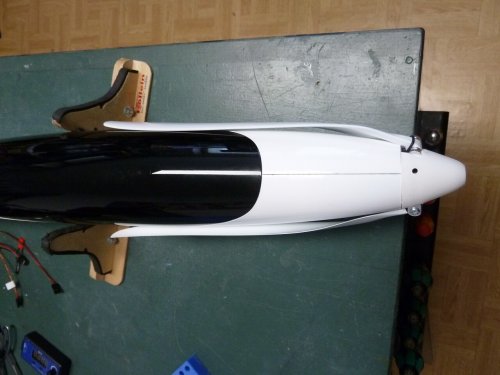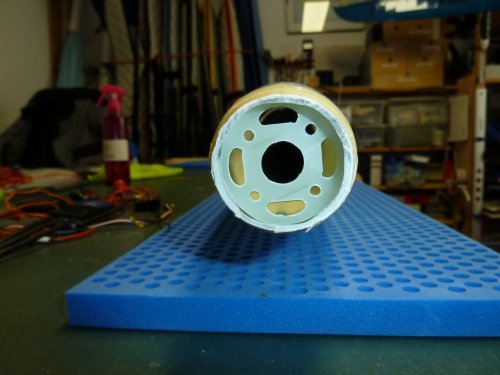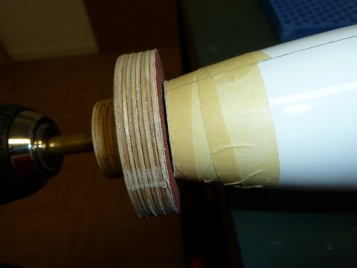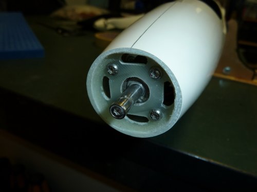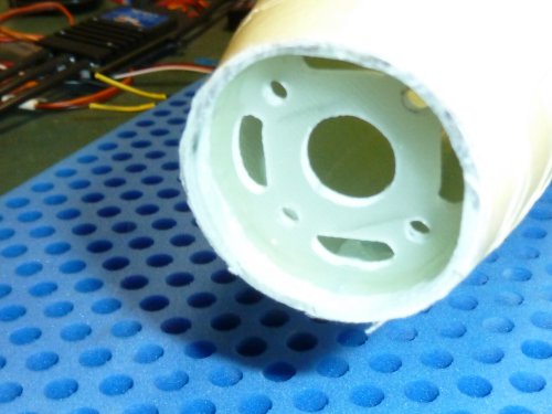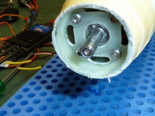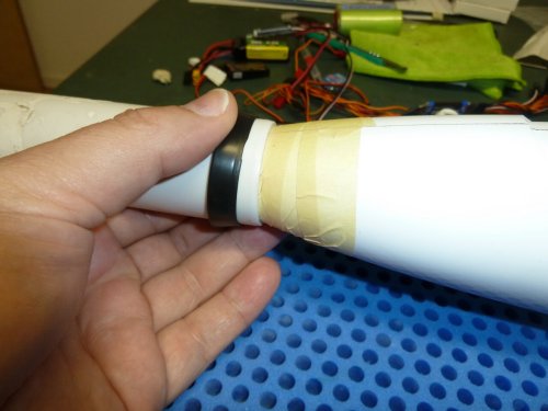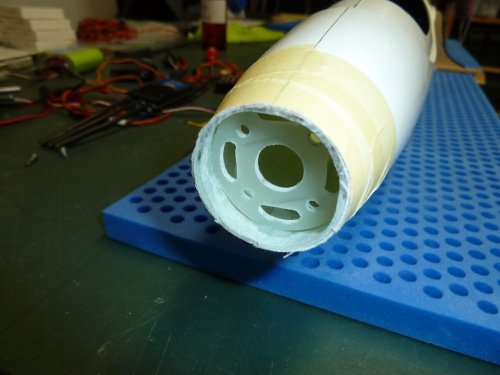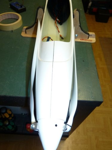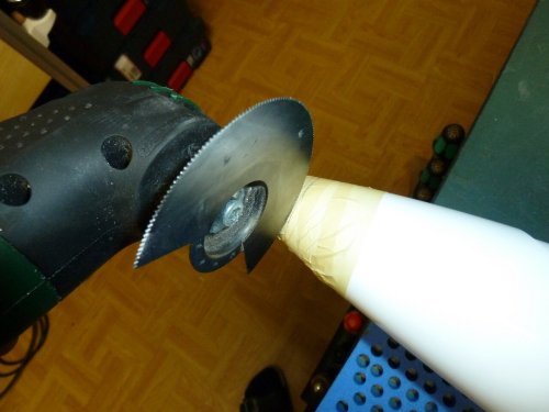 Zum Einsatz kommt ein 38mm Turbospinner. Um Luft für Anpassungsarbeiten zu haben ist die Markierung am Rumpf mit einem alten Abflussrohr erstellt, das 36mm Innendurchmesser hat. Die Ausrichtung ist grob so gehalten, dass das imaginäre Rohrverlängerung in Richtung Steckung zeigt. Dann kam der Akku Oszillierer aka "Multimaster" zum Einsatz. Mit dem feinsten Sägeblatt (Holz) war die Nase in wenigen Sekunden abgeschnitten. Ein zum Getriebe passender, 38mm messender Motorspant war noch im Fundus vorhanden und wurde, nach dem anschleifen, im Rumpf angepasst und die Ausrichtng des Motors überprüft. Der zeigt auch in Richtung Steckung, was genügend "Sturz" bringen sollte um ein wildes wegsteigen beim Steigflug zu vermeiden.