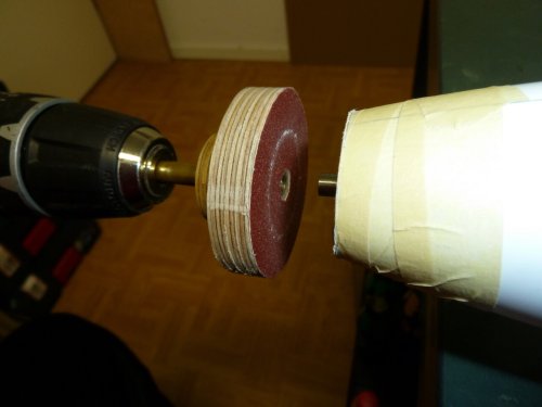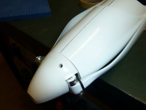 Das Ergebnis ist ein fest sitzender, sauber verklebter Motorspant. Der Übergang zum Spinner wurde mit meinem DIX-Schleifaufsatz mit dem Akkuschrauber passend zum Spinner verschliffen. Durch das Messingrohr hat das Schleiftool eine saubere Führung sodass die Spaltmaße sehr sauber sind.