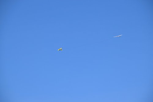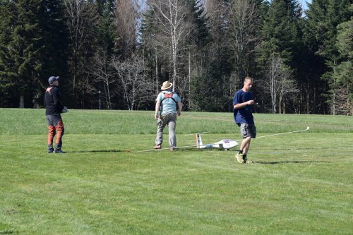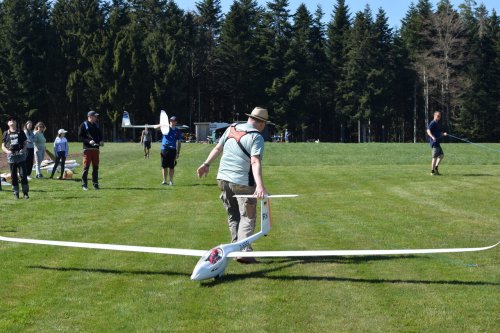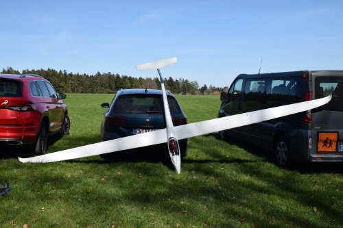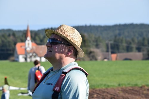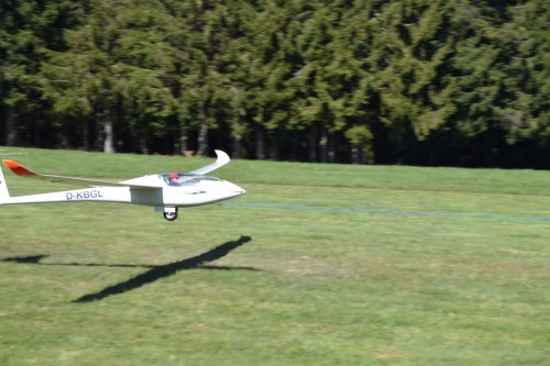 Nach dem Aufbau und einem finalen Check sowie Fototermin, ging es dann auf den Platz zum F-Schlepp. Die Wilga von Sammy stand schon bereit und schnell war der Shark eingehängt und zum Abflug fertig. Nach ein paar Metern hob er ab und ich musste nicht einen Tacken trimmen. Es hat einfach alles so wie in der Werkstatt eingestellt gepasst.