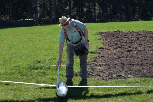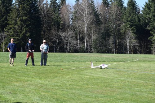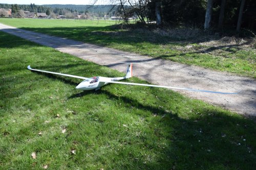 Nach gut einer halben Stunde und zwei Steigflügen, die insgesamt etwa 1Ah Akkukapazität erforderten, stand die Landung auf dem Programm. Wegen des Südostwindes war eine Landung über den Wald mit anschließendem, massiven Höhenabbau nötig. Nicht unbedingt ein Traum, wenn noch keine Tiefenruderzumischung programmiert wurde. Daher hab ich vorher in Sicherheitshöhe kurz die Klappen ausgefahren und festgestellt, dass bei voll gesetzten Wölbklappen etwas Tiefenruder-Zumischung nötig ist.