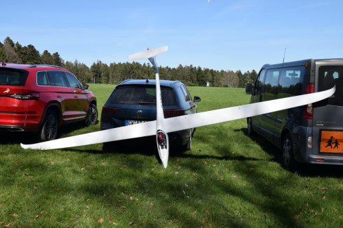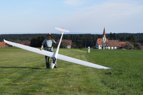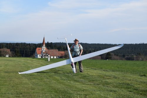 Sicherheitshalber wurde noch ein klein wenig Höhe getrimmt und der erste Thermikbart war auch schon gefunden. Die Kriesflugeigenschaften sind der Modellgröße entsprechend gut. Er kann auch eng kreisen, braucht aber Fahrt.