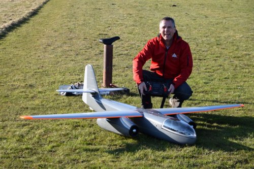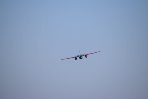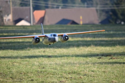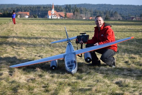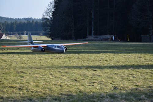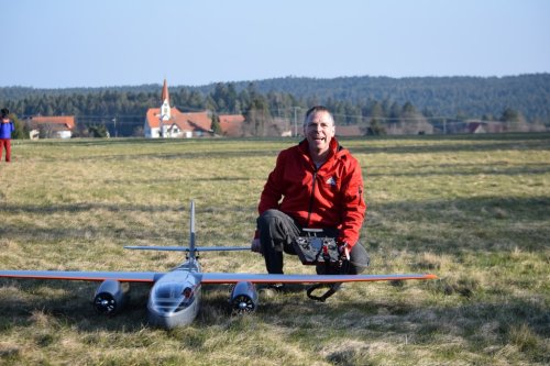 Nach einigen Rolltests und einem Probeflitschen ohne Zuhilfenahme des Antriebs war dann die Stunde des Erstfluges gekommen. Ein sichtlich nervöser Joachim gab das Startsignal und die beiden 6s Elektro-Impeller brachten den Arado mit Hilfe der Flitsche in die Luft. Das Modell war von Anfang an problemlos zu steuern und lag wunderbar in der Luft. Auch die Landung war butterweich. Nach dem tollen Flug und der geglückten Landung war die Erleichterung beim Piloten groß.