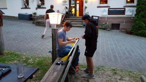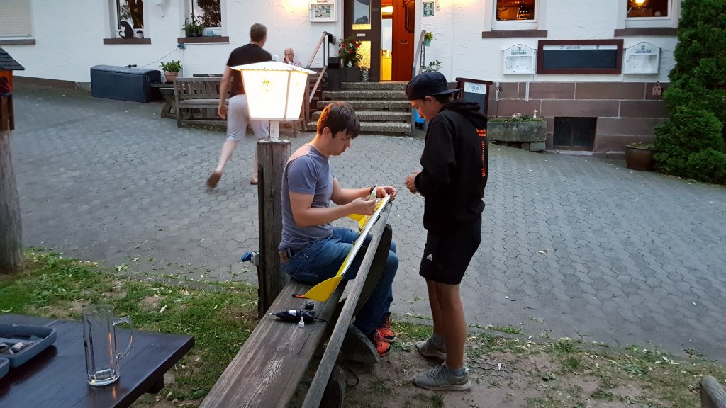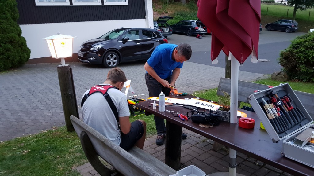 Die Abende waren wie immer sehr schön in Karolas Biergarten, obwohl der ein oder andere Gewitterschauer uns vorzeitig zum Umzug zwang. Wie immer gab es noch einige Flüge mit Funglider und Co. und Claudio scheuchte seinen Goblin noch lautstark durch die Lüfte zur Freude der Gäste in der benachbarten Jugendherberge. Dr. ELAPOR nahm auch noch erfolgreich eine OP am offenen Leitwerk eines verunfallten Funglider vor.