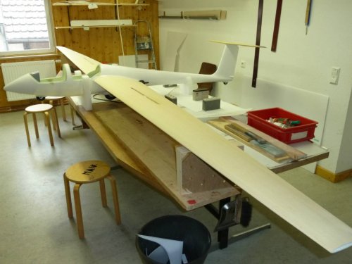 Nun galt es mit dem Meterstab das Modell in Waage zu bringen und es stellte sich heraus, das in Grundstellung die Flächen insgesamt etwas nach links unten standen (ca. 3-4cm). Also mit schnell gefertigten Keilen die Steckung links etwas unterlegt und wieder kontrolliert - Passt. Das HLW musste auch noch minimalst unterlegt werden und alles war nun im Lot. Einziger Wermutstropfen: Durch die leichte Anhebung der Steckung links (ca. 1mm) ist der Abschluß mit der Flächenanformung etwas ungleich, verglichen mit der rechten Seite. Aber eine genaue Geometrie ist meiner Meinung wichtiger als eine perfekte Optik. Etwas nachschleifen an der Fläche kann diesen Makel aber auch beheben. Zudem merkt man es nur, wenn man wirklich genau drauf schaut.
