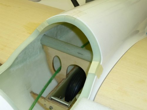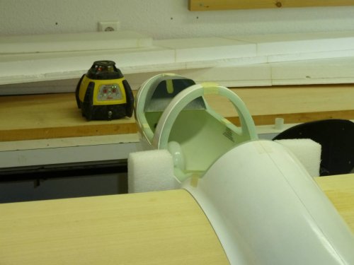 Nun muß ich nur noch in Ruhe die Steckung mit eingedicktem Harz (Baumwollflocken) fixieren und darüber kommt ringsherum noch eine Lage 160er Glasgewebe, damit die Fläche schön glatt ist und man nich beim Hantieren im Rumpf daran hängen bleibt.