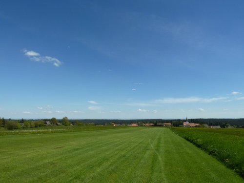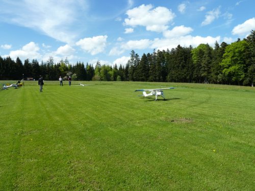 Da der Pfingstsamstag laut Wettervorhersage der einzig schöne Tag am Pfingstwochende werden soll und zudem nur dann Motorflug auf dem Platz gestattet ist, war das Zeitfenster klein. Zudem standen noch andere Termine an. Aber ich wa punkt 15 Uhr auf dem Platz bei bestem Wetter aber etwas böigem Wind aus südöstlicher Richtung. Schleppen richtung Ort war also angesagt. Das bedeutet im Gegenzug Ladeanflug über die hohen Bäume, was gewisse Anforderungen an die Störklappen stellt und den Puls nochmal steigen lässt.