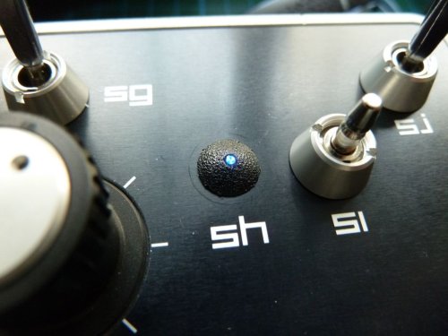 Ein Drucktaster, der zum ein bzw. Ausschalten sowie zum "Paaren" benötigt wird, wurde in einen freien Schalterplatz eingebaut und über dünnen Fädeldraht mit der Modulplatine verbunden. Die Antenne wird über ein RG-178-Kabel über ein Schraubenloch, welches für die Senderbefestigung gedacht ist, nach außen geführt.Wie bei 2,4GhZ üblich, sind die letzten 3cm der Antenne von der Abschirmung befreit und mit Schrumpfschlauch versiegelt.