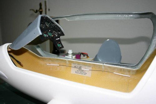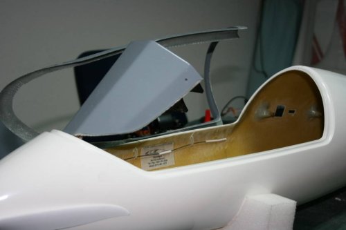 Das Problem ist die Krümmung des Haubenausschnittes und somit die nicht gerade Scharnierline. Hier ist beim Klappen eine gewisse Ausladung gefragt. Dies ohne Einschnitt am Haubenauschnitt hinzubekommen war das Ziel. Das hat, auch nach zahlreichen Versuchen nicht geklappt. Also hab ich kurzerhand 2 Schlitze in die Seitenwand gesägt, damit das Scharnier möglichst weit außen sitzen kann. Hier kam mein nagelneues Akku-Multitool (Bosch PMF) zu seinem ersten Einsatz und hat sich schon fast bezahlt gemacht, kann man damit doch sehr schnell, sauber und präzise die Einschnitte realisieren. Die Scharniere selbst hab ich dann grob konstruiert (dank Google gab es hier ein paar Anregungen) und mit der Dekupiersäge aus 1,5mm GFK Material im Doppelpack herausgesägt. Dank Sekundenkleber und Aktivator war die Ausrichtung schnell erledigt. Als Scharnierachse fungiert ein 1.3mm Federstahldraht, der federnd aufgehängt ist, damit die Haube maximale Ausladung bekommt, was dringend nötig ist.