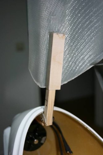 Der Klappmechanismus des Instrumentenpilzes war etwas einfacher zu machen. Auch hier stand eine einfache, schnell entnehmbare Lösung im Vordergund. Hier war wieder einmal die Sternstunde meiner Mini-Kreissäge. Mittels eingesägter Schlitze im Sperrholz konnten die GFK-Streifen perfekt sitzend fixiert und mit Sekundenkleber gesichert werden, sodass ein Aufnahmekasten für den "Scharnierzapfen" geschaffen werden konnte. So kann der ganze Instrumentenpilz im Nu komplett abgenommen werden.