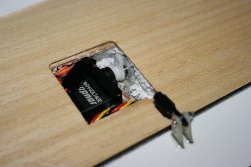 Zunächst waren eigentlich die S-3174 für das Querruder vorgesehen, nachdem ich aber mit der Bauform schlechte Erfahrungen in anderen Seglern gemacht hatte (Lagerschalen im Kunststoffgehäuse schlagen aus) sind sie zu den Störklappen "degradiert" worden. Alls Klappenservos sind mit Gegenlagern versehen. Diese sind z.T. unterhalb der Baplankung positiuoniert, was bei der Demontage sicher Probleme aufbringt. Damit muss ich aber leben, da ich die Einbauschächte nicht vergrößern wollte.