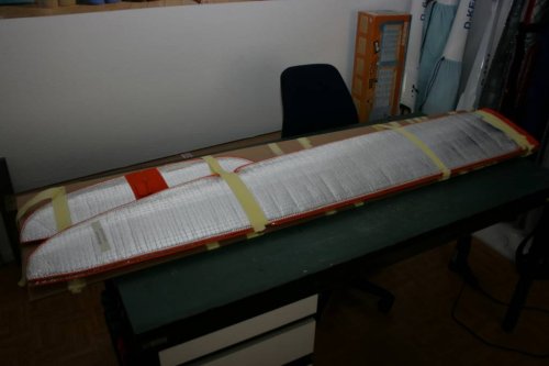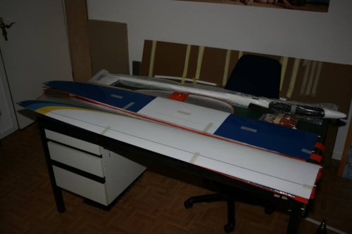 Nachdem der Karton entfernt war, zeigte sich das Modell schick verpackt in den Flächen- und Leitwerkswerkstaschen. Der Rumpf war in Luftpolsterfolie gut gesichert. Das Zubehör in der extra Tüte komplett mit allen notwendigen Teilen für die RDS-Anlenkung meiner bereits vorhandenen KST DS 225MG HV Servos.