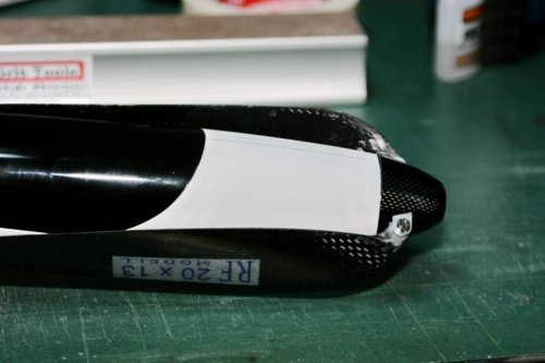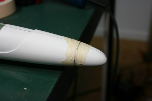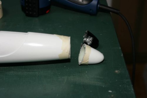 Zuerst musste sich der Rumpf einer Nasen-OP unterziehen. Die Trennstelle wurde grob auf den mit Kreppband getapten Rumpf angezeichnet und danach wurde die Nase kurz und schmerzlos mit meinem Akku-Multitool abgesägt. Da das Multitool gerade auf dem Tisch lag, wurde der Haubenausschnitt ebenfalls erweitert, damit der 6s3800mAh Lipo mitsamt Regler hineinpasst. Das hat mir das Sägeblatt etwas übel genommen sodass es an einigen Stellen nunmehr ziemlich ausgelutscht ist. Das ist halt der Nachteil an GfK, es ist ein rechter Sägeblattfresser.