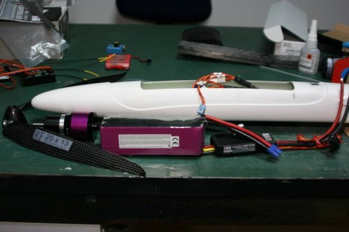 Der Akku passt zwar liegend in den Rumpf, jedoch ist am Akkukabelaustritt noch zu wenig Platz weshalb hier noch später nachgearbeitet werden muss, damit der Akku bequem in den Rumpf passt. Um den Schwerpunkt ohne Bleizugabe zu erreichen ist es erforderlich, den Akku zwischen Motor und Regler zu platzieren. Die Motorkabel werden dann unter bzw. neben dem Akku entlang geführt.