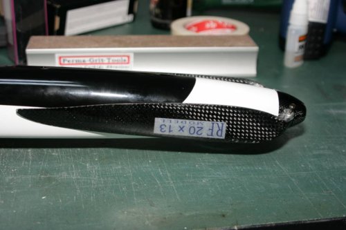 Durch den benötigten Raum für die Motorkabel ergibt sich der Motorsturz nach unten quasi automatisch. Oben ist aber sehr wenig Platz aber das muss reichen. Nachdem der Spant ausgerichtet und der Motor auf freien Lauf überprüft wurde, hab ich den Spant mit 4 Tropfen Sekundenkleber fixiert und mit meiner Spezial-Schleifscheibe (dicke Messingscheibe mit 6mm Loch und aufgeklebtem Schleifpapier) den Spinner grob angepasst. Der Spinner wurde leider in Sichtcarbon geliefert und muss später weiß lackiert werden. Die 20 x 13 RFM Klapplatten werden evtl. auch noch weiß lackiert, damit sie nicht allzu sehr auffallen.