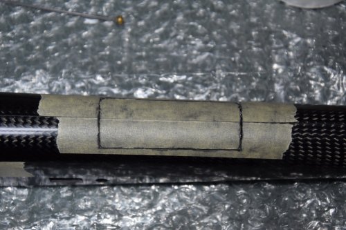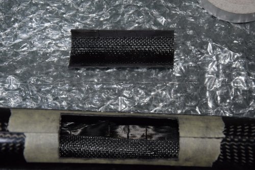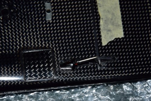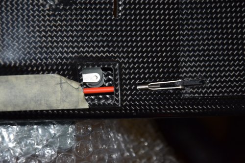 Die Befestigung des Bowdenzugrohres im Rumpf selbst war auch etwas abenteuerlich. Ein NAchteil am Carbonrumpf ist der, das es innen zappenduster ist und auch eine starke LED-Taschenlampe nicht weit hineinleuchten kann. Abhilfe hat meine USB-Endoskopkamera geleistet, die am Tablet angeschlossen war und Bilder aus dem inneren zeigte. Das Bowdenzugrohr wurde mit Powermagneten an der Rumpfwand fixiert und Harz anschließend über einen an einer 6ml Spritze angebrachten PVC-Schlauch injiziert. Hierbei war die Kamera rund 6cm vor dem Schlauchende fixiert, sodass ich live im inneren das Harz dosieren konnte und sichergestellt war, dass es am richtigen Platz landet. Bilder von der Liveübertragung gibt es leider keine, da keine Hand frei war. Das Harz wurde von der Serviceklappe und von der Seitenflosse aus eingebracht womit das Bowdenzugrohr nun wunderbar fixiert ist.