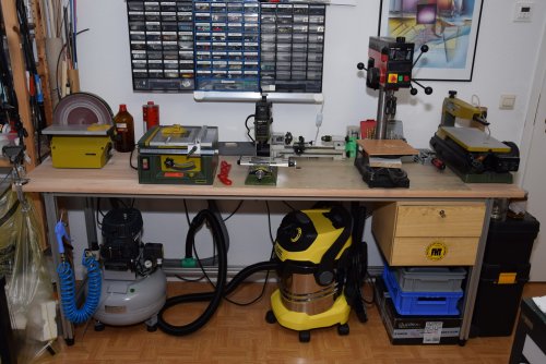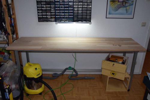 Mein alter Maschinentisch in der Werkstatt hat schon einige Jahre auf dem Buckel, stammt der Schreibtisch, der als Basis dient, noch aus den Achtzigern. Zudem ist er etwas zu klein und bietet daher nicht genügend Platz für meinen mittlerweile angewachsenen Maschinenpark. Auch die MPX-Platte zur Erweiterung reicht nicht mehr aus und schwingt am Rand recht unangenehm. Höchste Zeit also für soliden und dauerhaften Ersatz.