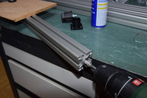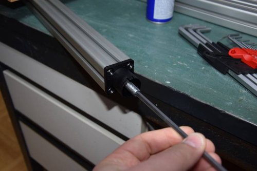 Begonnen habe ich an den Tischbeinen, denen ich verstellbare Füße spendiert habe. Zur Montage der Füße musste noch ein M8 Gewinde in das Kernloch geschnitten werden. Dazu hab ich das Profil mit einer Schraubzwinge und einem Brettchen als Schutz an der Werkbank fixiert und das Gewinde mit einem Akkuschrauber geschnitten. WD40 diente als Scheidöl, da mir die nicht zur Verfügung stand. Danch konnten die Füße montiert werden, die beiden Nasen dienen als Verdrehschutz.