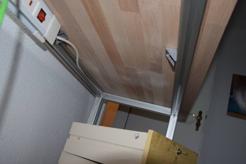Bei der Demontage des alten Schreibtisches zeigte sich, dass die Schubladen eine eigene Einheit bilden. Das qualifizierte sie zur Weiterverwendung am neuen Maschinentisch. Mittels M6-Nutensteinen und passenden M6 Senkkopfschrauben wurde der Schubladenkasten rechts oben an das Profil geschraubt sodass mir weiterhin Schubladen als Staufächer für Bohrer usw. zur Verfügung stehen und ich mir keine neue Lösung hierfür überlegen muss. Der Rest des alten Schreibtisches wird entsorgt.