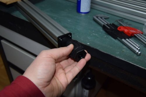 Zur Verbindung der Profile untereinander verwende ich die speziellen Profilverbinder. Hier wird der Träger mit Schraube mittels Linksgewinde in einen der Profilflügel geschnitten (WD40 dient wieder als Schneidöl). Um einen guten Halt zu gewähren hab ich jeweils zwei Verbinder in die gegenüberliegenden Profilflügel eingeschraubt. Nach dem durchdrücken der Schraube wird die Nutmutter aufgedreht und das Profil kann in die Profilnut des zu befestigendes Stranges geführt werden. Mit einem 5mm Inbusschlüssel wird die Verbindung fixiert und die Sache hält bombenfest.