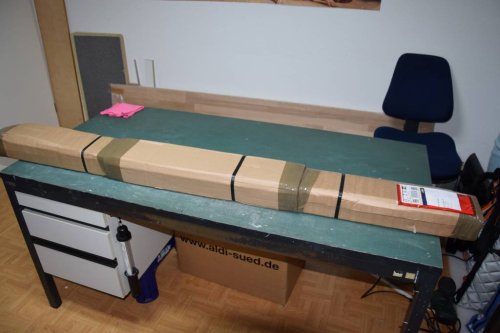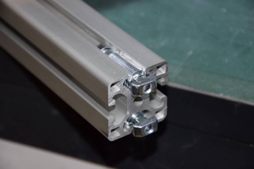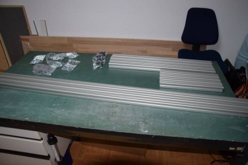 Also fiel die Wahl beim Untergestell auf 40mm Aluprofil (I-Typ). Dieses bekommt man in vielen Webshops auf Maß zugesägt und das nötige Zubehör wird gleich dazu angeboten. Als Platte wurde eine 27mm Buche-Massivplatte auserkoren mit 60x240cm Rohmaß und einer abgerundeten Kante. Nachdem alle Materialien eingetroffen waren, konnte die Montage des Untergestells beginnen.