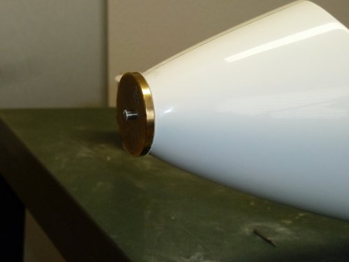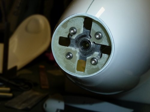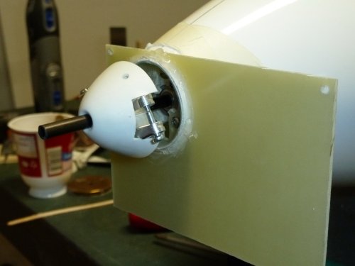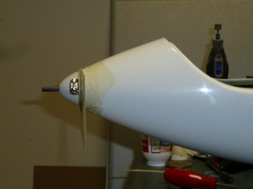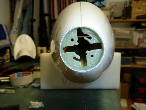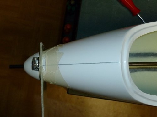 Nun war da noch das Problem mit dem ovalen Rumpf. Der stellte sich als recht widerspenstig heraus und ich musste mir was einfallen lassen. Da da der orignale 44mm Motorspant einen Hauch zu klein war, hab ich kurzerhand einen etwas größeren im gleichen Stil entworfen und auf meiner Fräse erstellt. Der daraus resultierende Abfall wurde kurzerhand als äußere Kulisse verwendet um die ovale Form zu bändigen. Frei nach dem James Bond Cocktailmotto "Das Ovale muss in das Runde", also die Olive ins Glas, wurde erst etwas Malerkrepp auf den Rumpf zum Schutz augkeklebt und danach mit sanfter Gewalt die Rundkulisse über die Rumpfspitze gezogen. Um sicher zu stellen, das das auch hält wurde das Konstrukt mit etwas Heißkleber fixiert. Nun war alles so wie es sein sollte und das mit Baumwollflocken eingedickte Harz konnte aufgetragen werden. Sicherheitshalber wurde danach alles noch einmal mit dem Spinner auf sauberen Sitz und Ausrichtung kontrolliert.