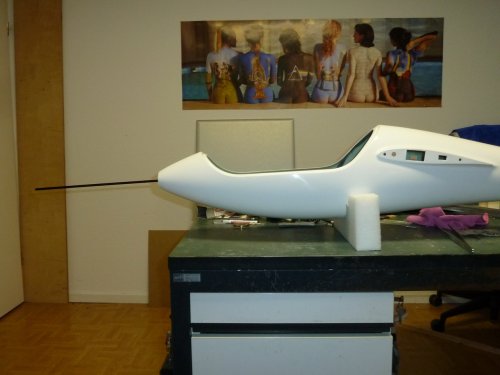 Der nächste Schritt ist ein nochmaliges Balancieren des Rumpfes, um die finalen Einbaupositionen der Antriebs und RC-Komponenten festzulegen. Danach wird der Hilfsspant mit Schleppkupplung samt Servo sowie der Flitschenhakenaufnahme konstruiert und fertiggestellt.