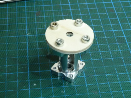 Nach dem Aushärten konnte die ganze Konstruktion wieder entfernt werden und der Motor wurde befestigt. Abschließend musste nur noch der Übergang auf Maß und bündig verschliffen werden. Dazu nutze ich eine Messingscheibe, die im Metallschrott gefunden hab. Diese hat mittig eine 6er Bohrung und auf die Scheibe hab ich gröberes Schleifpapier geklebt. Es hat etwas gedauert bis alles passt, aber es kann sich sehen lassen.