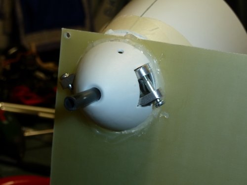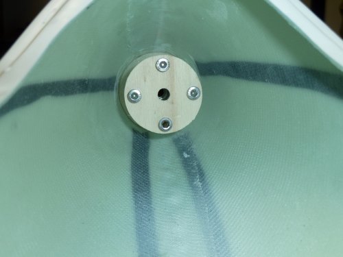 Nun stellt sich die Frage, wie muss der Spant ausgerichtet werden. Ich finde es eine schlaue IDee das so zu gestalten, dass die gedachte Verlängerung der Motorachse zum Schwerpunkt zeigt. Um das zu testen, ist der Reisenauer Glider-Adapter wirklich eine tolle Sache. Ich musste nur den Lochkreis am Motor abnehmen und mittig ein 6mm Loch vorsehen, schon war die Schablone fertig, die statt des Motors auf den Glider Adapter geschraubt wird. Mittels eines 6mm Carbonrohrs konnte die Exakte Ausrichtung des Spantes bestinmmt werden. In der Position wurde der Spant dann seitlich mit Sekundenkleber fixiert.