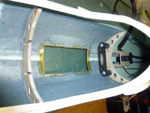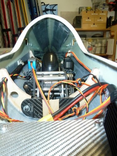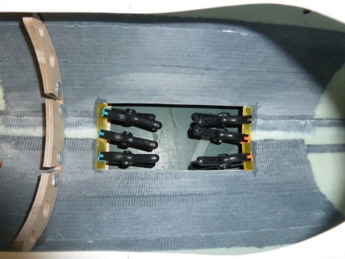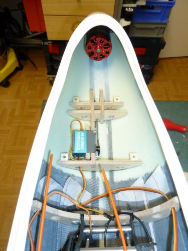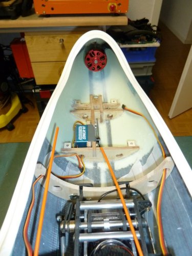 Letztlich ist das Ergebnis aber sehr brauchbar und zweckmäßig. Das Original-Akkuauflagebrett wurde längs etwas beschnitten, damit es, mit Schrauben befestigt, auf dieser Konstruktion Platz nimmt. Dadurch liegt der Akku etwas tiefer und kann noch etwas weiter nach hinten. Wie bei den anderen Scale-Fliegern von mir auch ist im vorderen Teil der Konstruktion der entnehmbare Flitschenhaken (mit Powermagneten im Klemmbereich damit der Ring ohne Zug nicht runterfällt) sowie die Schleppkupplung am Rumpfboden. Alles natürlich außerhalb des (angelegten) Propellers.