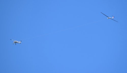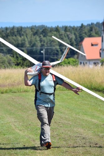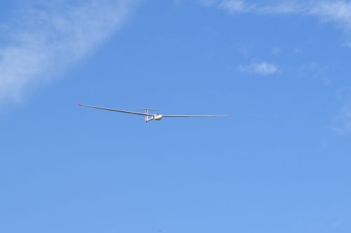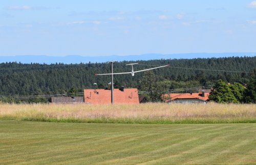 Nach den üblichen Vorbereitungen, Tests und den obligatorischen Fotos, ging es dann hinter Ulis Wilga. Sicherheitshalber hab ich gleich den Kreisel aktiviert, da kurz nach dem Abheben schon einiges an gewackel zu befürchten war. Ich sollte mich nicht getäuscht haben. Da die Sichtverhältnisse eher mittel waren, hab ich dann auf 400m ausgeklinkt und es ging auf Thermiksuche. Da die ASH vom ersten Moment an gut lief waren keine nenneswerten Korrekturen nötig. Das Wetter gab aber auch keine weiteren Einstellarbeiten her. Das muss zu einem späteren Zeitpukt bei ruhigerem Wetter erfolgen.