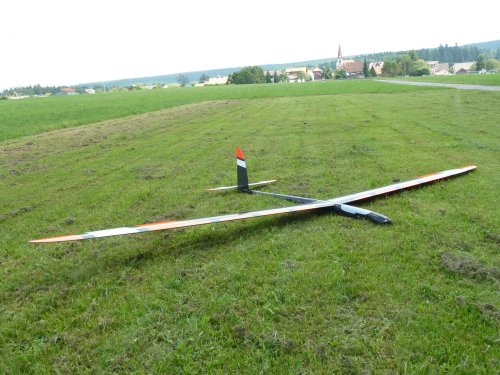 Die Woche nach dem Urlaub war einigermaßen geschäftig und so konnte ich die letzen Arbeiten, nämlich den Einbau der RC-Komponenten im Rumpf und die Erstellung und befestigung des Akkubretts abgeschlossen werden. Dann war es noch nötig die Ruderwege einzustellen und den Sender auch entsprechend vorzubereiten. Abschließend wurden noch EWD (ca. 1°) und der Schwerpunkt (110mm) eingestellt sodass dem Erstflug nichts mehr im Wege stand.