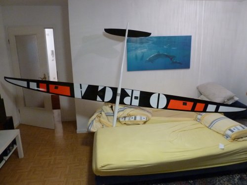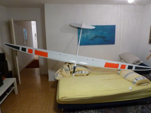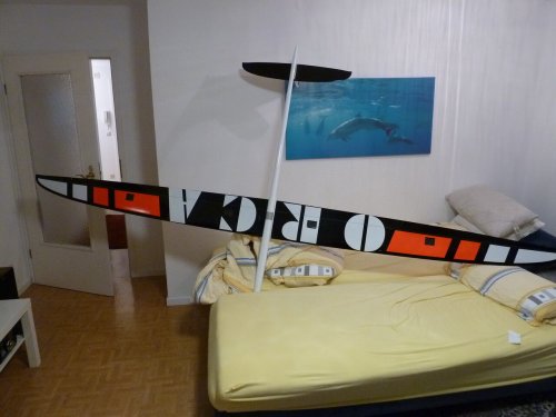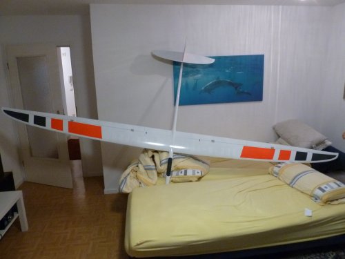 Der Pro unterscheidet sich nur durch einen etwas längeren Rumpf mit bulligerer Seitenleitwerksflosse und einem etwas vergrößerten Höhenleitwerk von seinem Vorgänger. Leider führt die große SLW-Flosse dazu, dass die vorgesehene Modell-Tragetasche nicht verwendet werden kann, weil einen Tick zu klein. Aber eine etwas ältere Tasche passt so gerade und wird stattdessen verwendet. Das bringt zwar meinen Taschen-Farbcode durcheinander, ist aber hinnehmbar.