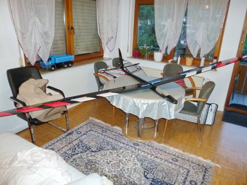 Empfänger ist ein Jeti REX 10 mit einem REX 3 als Satellit (via EX-Bus). Die Telemetrie in Form des Vario, GPS und Antriebsvermessung, erledigt ein Eigenbau-Sensor auf Basis des VarioGPS.