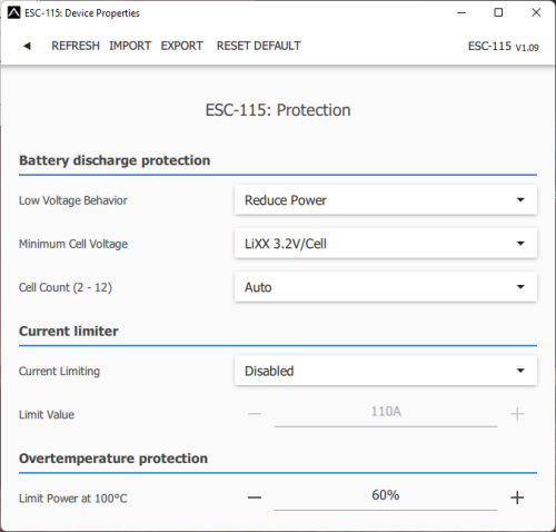 Die Einstellfenster sind wie die Baumstruktur im Jetibox-Menü funktional unterteilt in Allgemeine Einstellunge, Motor-Einstellungen, Schutzeinstellungen sowie Telemetrie-Einstellungen.