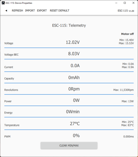 Letzteres ist in einer separaten Firmware implementiert. Also muss entweder das Modell mit Spektrum-Telemetrie geordert werden oder der Regler mit dem MAV-Manager mit der entsprechenden Firmware versehen werden. Hierzu ist löediglich ein USB-Seriell-Wandler erforderlich, wie er auch zum Firmware-Update von Empfängern etc. verwendet wird.