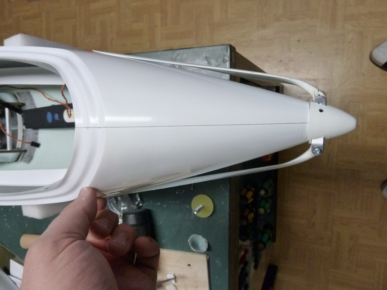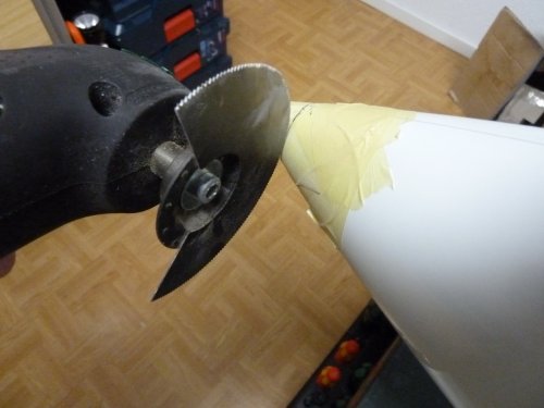 Zuerst wurde, wie immer, der Rumpf mit Kreppband abgeklebt und eine Schnittkante mit Bleistift angezeichnet. Danach trat die Virbrationssäge an um die Rumpfspitze in wenigen Sekunden abzutrennen. Ziel war es, die spitze Rumpfform mit einem entsprechend spitzen 32mm Spinner abzubilden. Das hat so aber nicht geklappt. Das 30mm Mittelteil war viel zu breit und die Klapplatten haben viel zu weit ausgekragt, was einerseits doof aussieht und andererseits den Luftwiderstand unnötig erhöht. Also ging Plan B in Richtung 38mm Spinner. Das sah aber auch nicht toll aus, weshalb ich letztlich bei einem 40mm RFM-Scalespinner mit 32mm Mittelteil gelandet bin.