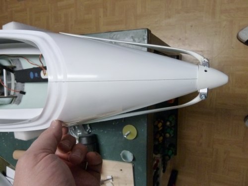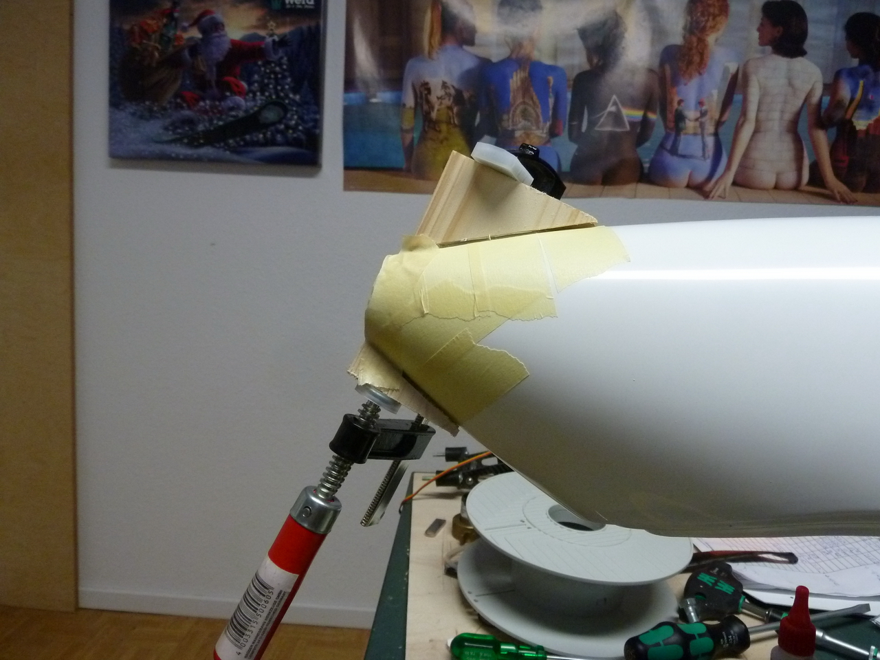 Dann war da noch das Problem mit der ovalen Rumpfform. Eine Spannvorrichtung mit M6 Schraube war zwar effizient, jedoch vermag diese Vorrichtung nicht, den "Hubbel" oben an die Spantform anzugleichen. Nach einigen Überlegungen hab ich daher eine Druckvorrichtung gebastelt. Dazu hab ich die Nase mit Krappband abgeklebt und Holzkeile mittels Schmiege angefertigt. Diese wurden mit Heißkleber auf das Kreppband geklebt um der Schraubzwinge zu ermöglichen, den Rumpf in Form zu drücken ohne abzurutschen. Nachdem die gewünschte Form erreicht war, wurde der Spant eingepasst und verklebt. Nach dem aushärten des Hatz wird die Rumpfspitze noch mit dem Fön getempert, um die Spannung wieder aus dem Material zu nehmen. Hier muss mit der Temperatur vorsichtig vorgeganegn werden, damit keine Spuren am Gewebe hinterlassen werden.