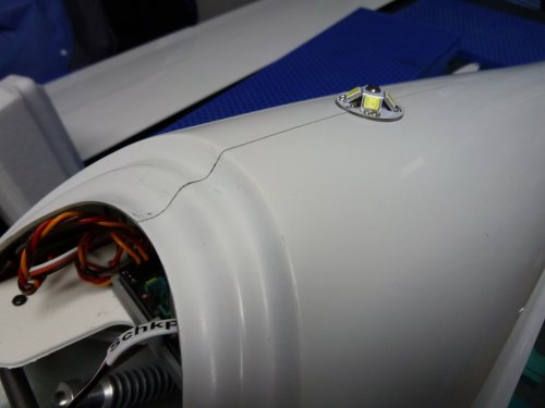 Am Rumpf wurde das ACL noch montiert und verdrahtet. Final kam das komplette Modell noch einmal auf die Schwerpunktwaage. Beim herstellerseitig genannten Schwerpunkt von 94mm hält das Modell in der derzeitigen Konfiguration die Waage. Ich denke aber der Schwerpunkt wird im Laufe der Zeit noch etwas nach hinten verlagert. Die EWD beträgt aktuell rund 0.95° was gut zum Schwerpunkt passt.