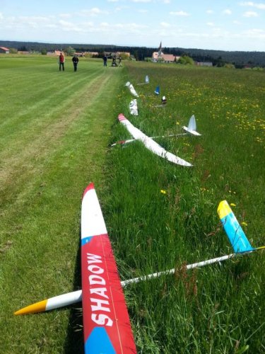 Leider gab es einen bedauerlichen Verlust eines hochwertigen Voll-GfK Seglers. Wegen eines technischen Problems mit der RC-Anlage war das Modell vom Start an unsteuerbar und drehte nach dem Ausklinken aus dem Schleppseil noch wild und schnell 2 Runden, bis es unweit vom Startplatz als Totalschaden im Feld einschlug.