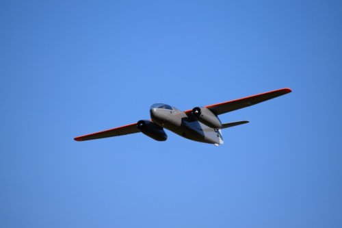 Das nicht ganz alltägliche Modell mit seinen 2 Impellern wurde von unserem Vereinskameraden Günter Fischer konzipiert. Es war der weltweit erste, strahlgetriebene Bomber und kam noch Ende des Zweiten Weltkriegs seiner zweifelhaften Bestimmung nach. Bombig an Joachims Modell ist aber die Bauausführung sind doch alle Formen etc. von Günter und seinem Team in bekannt toller Qualität erstellt worden.