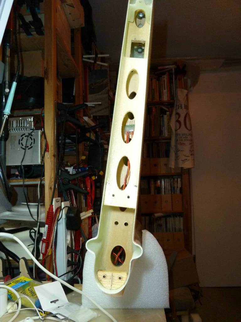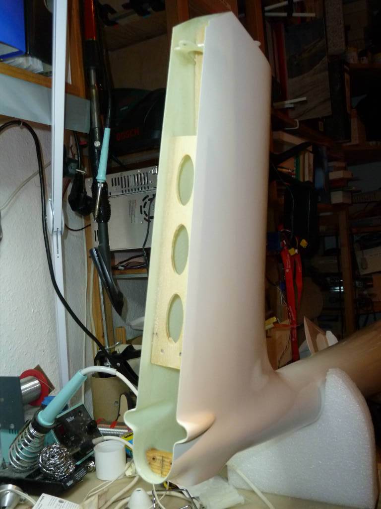 Zuerst wurde der Versteifungspant eingeharzt, auf dem sich auch das HR-Servo befindet, danach kam ein Teil der Abschlußleiste noch dahinter.