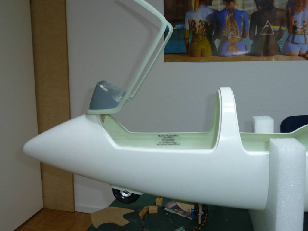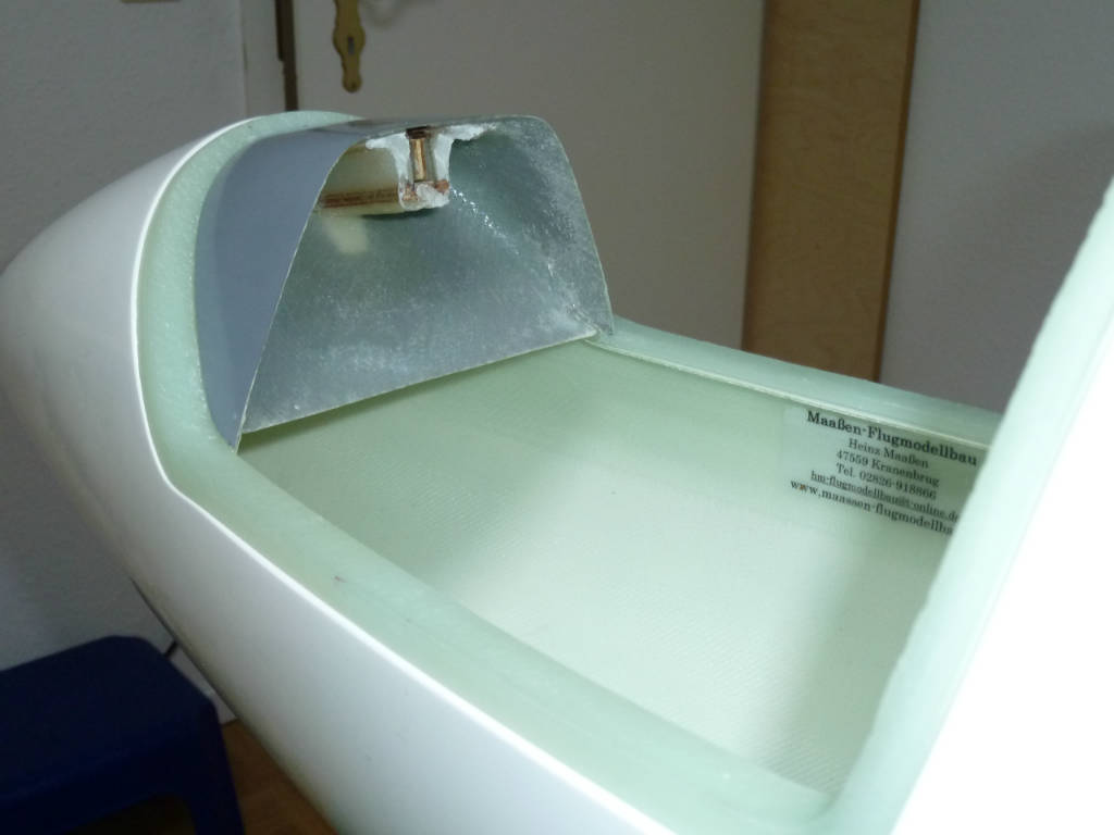 Problem bei der Sache war, das es keinerlei brauchbare Vorlagen gab und eine Eigenkonstruktion notwendig geworden war. Schließlich soll die Haube scaleähnlich nach oben klappen, damit man auch nach dem Flug auf dicke Hose machen kann (wenn der Pilot schon nix taugt
