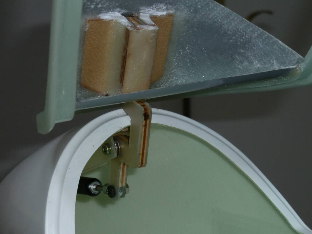 Die ganze Mimik wurde, in Ermangelung andere Ideen, mit ein paar Tropfen Heißkleber im Rumpf und unter dem Instrumentenpilz fixiert und anschließend nach Funktionskontrolle eingeharzt. Die Haube ist nun dank der Taschenlösung leicht entnehmbar, damit ich bei Wartungsarbeiten vorne ungestört an alle Komponenten herankommen.