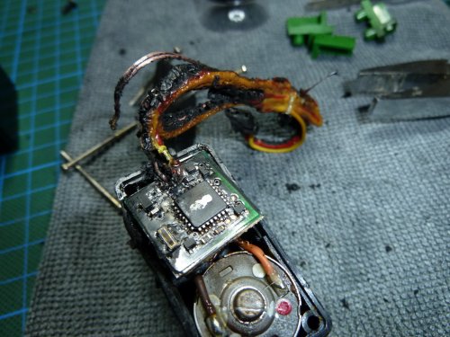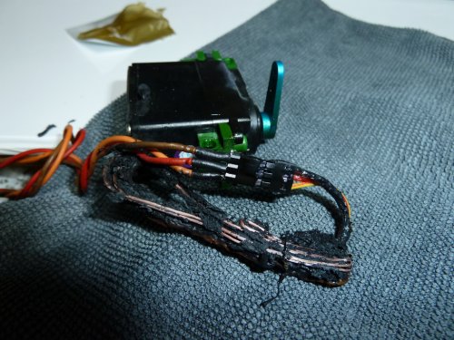 Es wurde offenbar durch eine Blockierung überlastet und ist dadurch furios abgeraucht. So etwas ist mir im jahrelangen Umgang mit Analogservos noch nicht untergekommen. Dazu sollte die digitale Steuerung doch eigentlich geschaffen sein, um solche Dinge zu vermeiden. Einen Serienfehler kann ich eigentlich ausschließen, da ich neue Servos am Servotester einlaufen lasse. Ich ging also davon aus, das die Servoendstufe abgeraucht ist und mehr nicht.
