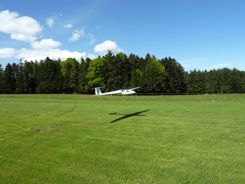 Da der Pfingstsamstag laut Wettervorhersage der einzig schöne Tag am Pfingstwochende werden soll und zudem nur dann Motorflug auf dem Platz gestattet ist, war das Zeitfenster klein. Zudem standen noch andere Termine an. Aber ich wa punkt 15 Uhr auf dem Platz bei bestem Wetter aber etwas böigem Wind aus südöstlicher Richtung. Schleppen richtung Ort war also angesagt. Das bedeutet im Gegenzug Ladeanflug über die hohen Bäume, was gewisse Anforderungen an die Störklappen stellt und den Puls nochmal steigen lässt.