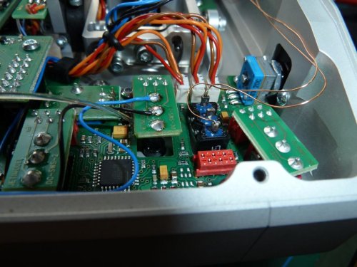 Ein Drucktaster, der zum ein bzw. Ausschalten sowie zum "Paaren" benötigt wird, wurde in einen freien Schalterplatz eingebaut und über dünnen Fädeldraht mit der Modulplatine verbunden. Die Antenne wird über ein RG-178-Kabel über ein Schraubenloch, welches für die Senderbefestigung gedacht ist, nach außen geführt.Wie bei 2,4GhZ üblich, sind die letzten 3cm der Antenne von der Abschirmung befreit und mit Schrumpfschlauch versiegelt.