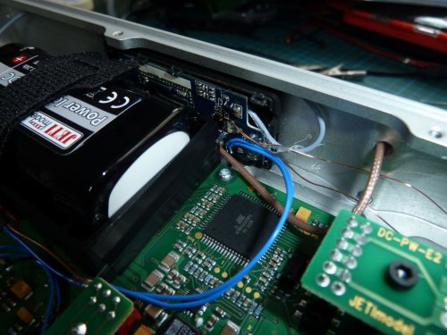 Eine Lötstelle am Sender musste ich anzapfen. Dies war der linke Audiokanal, der an den Signaleingang des BT-Modules gelötet wurde. Dies lässt sich leider nicht vermeiden, weil Jeti es versäumt hat, entsprechende Steckkontakte hier vorzusehen. Jeti hat zwar ein BT-Modul angekündigt, aufgrund der fehlenden Steckkontakte kann ich mir aber keine integrierte Lösung vorstellen. Eine externe Lösung kommt für mich jedoch nicht in Frage.