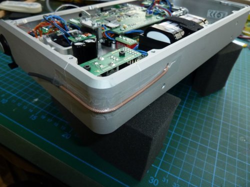 Da ich mein Headset immer am rechten Ohr trage, ist die Antenne auch an der rechten Seite des Gehäuses angebracht. Im Acrlypult soweit nicht sichtbar und diskret angebracht. Die Platinenantenne im Modul selbst wurde vorsichtshalber gekappt.
