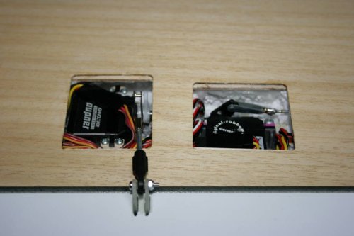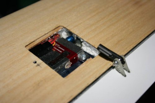 Zunächst waren eigentlich die S-3174 für das Querruder vorgesehen, nachdem ich aber mit der Bauform schlechte Erfahrungen in anderen Seglern gemacht hatte (Lagerschalen im Kunststoffgehäuse schlagen aus) sind sie zu den Störklappen "degradiert" worden. Alls Klappenservos sind mit Gegenlagern versehen. Diese sind z.T. unterhalb der Baplankung positiuoniert, was bei der Demontage sicher Probleme aufbringt. Damit muss ich aber leben, da ich die Einbauschächte nicht vergrößern wollte.