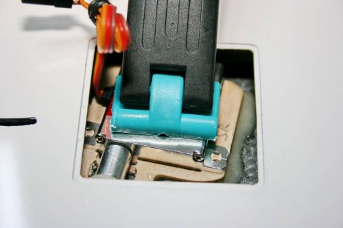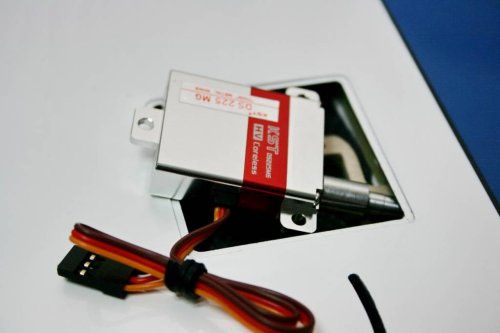 Zuerst einmal war ich im Zweifel, ob das doch recht große KST-Servo überhaupt in die Servoschächte passt. Nachdem die RDS-Welle aber abgenommen wurde, passte das Servo knapp in den Schacht. Die hintere Lasche kann nicht zur Befestigung benutzt werden, da keine Chance besteht an die Schraube zu kommen.